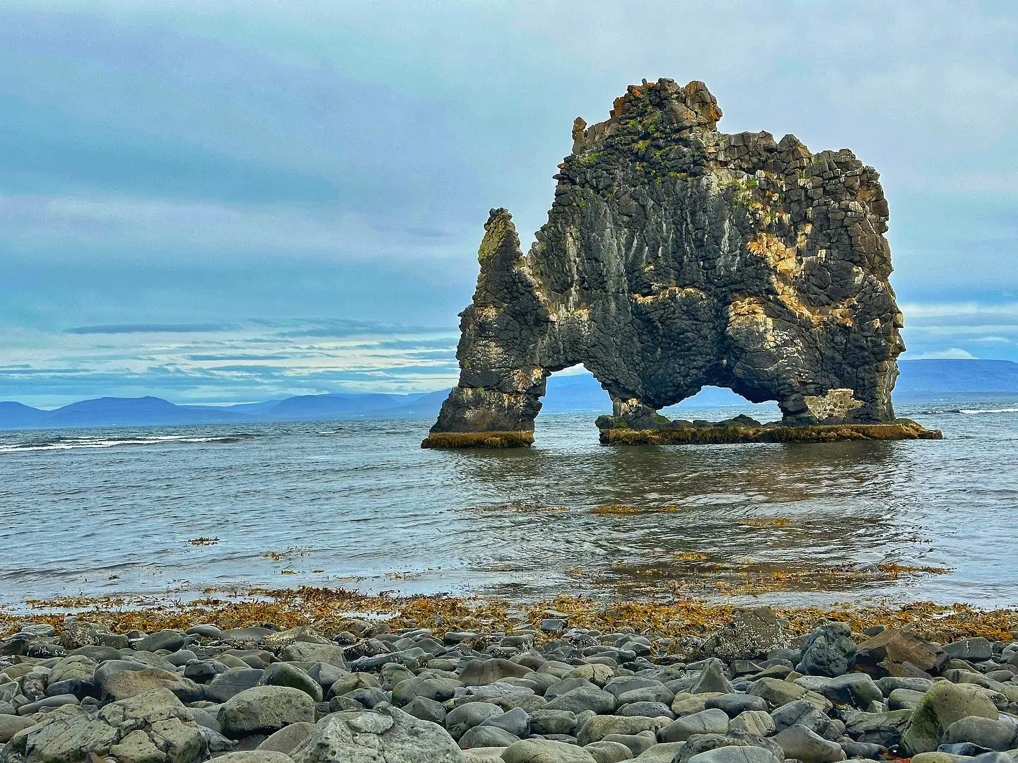 Hvitserkur is a 15-meter-high basalt rock in the shape of a dragon or dinosaur along Iceland’s northwest coast. It’s especially dramatic at low tide, when reflections on the wet sand enhance its silhouette.