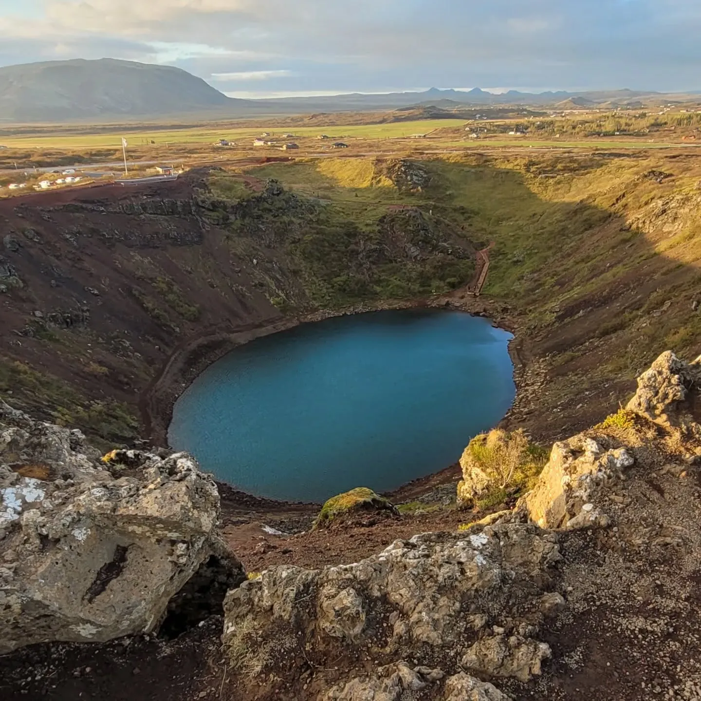 Kerið is a volcanic crater lake with vivid red, green, and blue contrasts. The turquoise water in the center contrasts perfectly with the red volcanic rock and mossy edges, making it a standout Instagram spot.