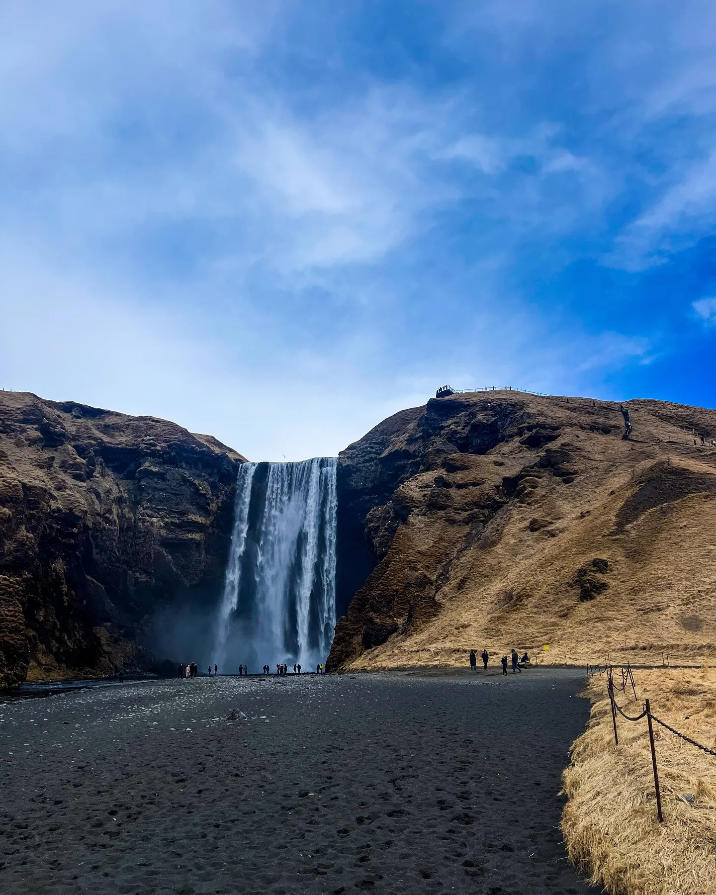 Not far from Seljalandsfoss is Skógafoss, another iconic waterfall that’s ideal for Instagram. With a drop of 60 meters, its powerful curtain of water produces rainbows on sunny days. Climb the stairs to the right of the waterfall for elevated perspectives of the waterfall and the surrounding landscapes.