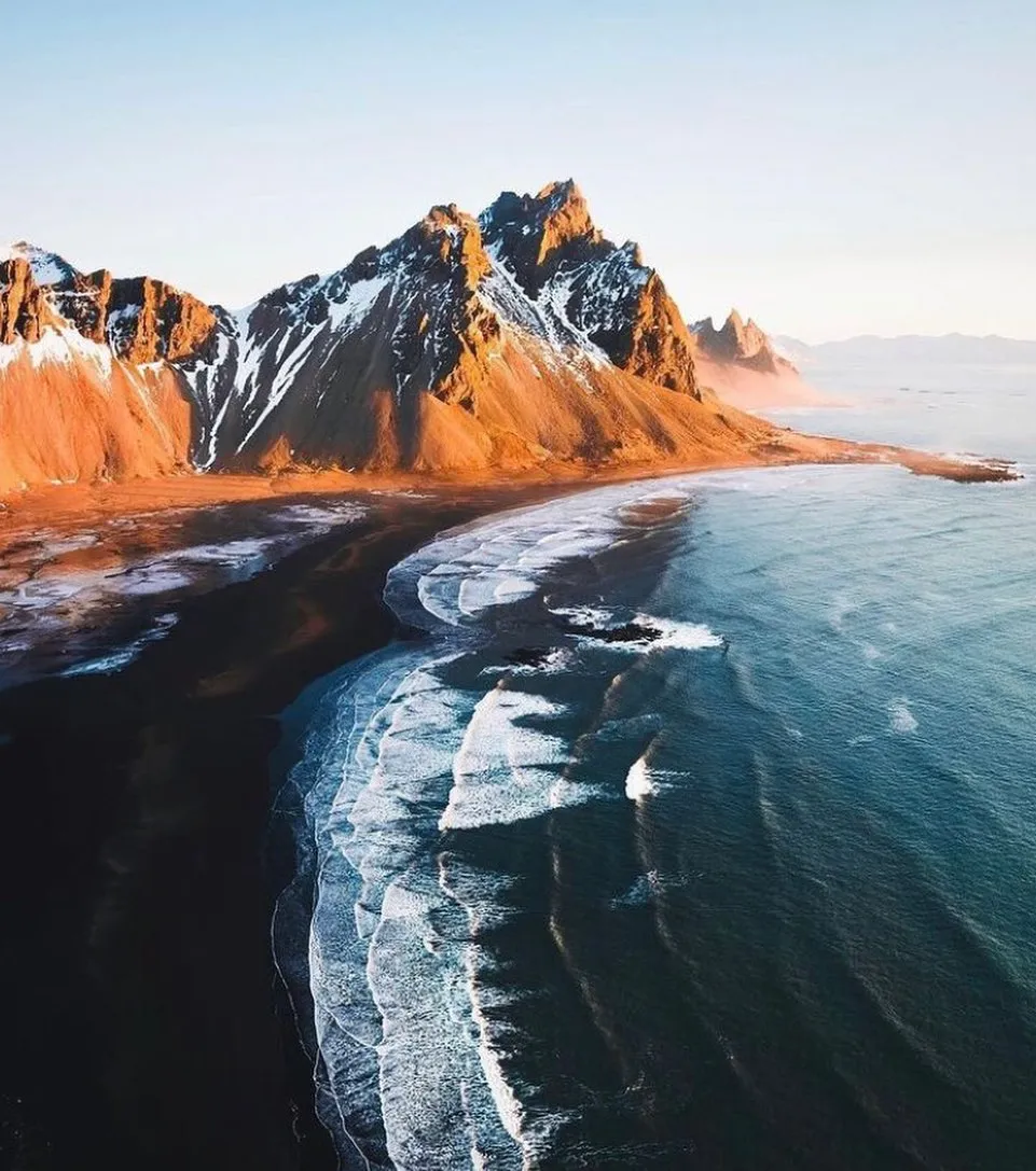 Located on the Stokksnes peninsula, Vestrahorn is a jagged mountain rising sharply from a black sand beach. The contrast of the dark sand, green moss, and jagged peaks is mesmerizing. Low tide often reveals reflective pools perfect for mirror-like shots.