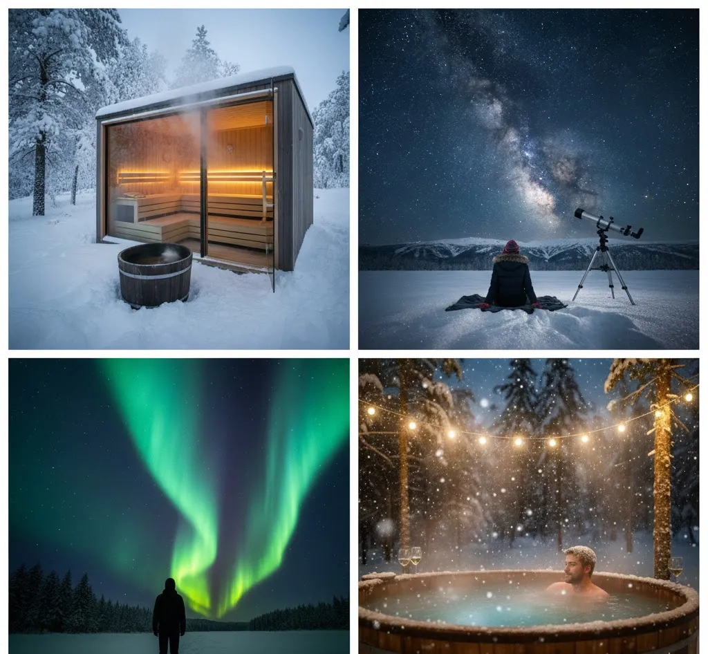 Arctic Circle surroundings, unique architecture, snow-covered treehouses, Swedish sauna culture.