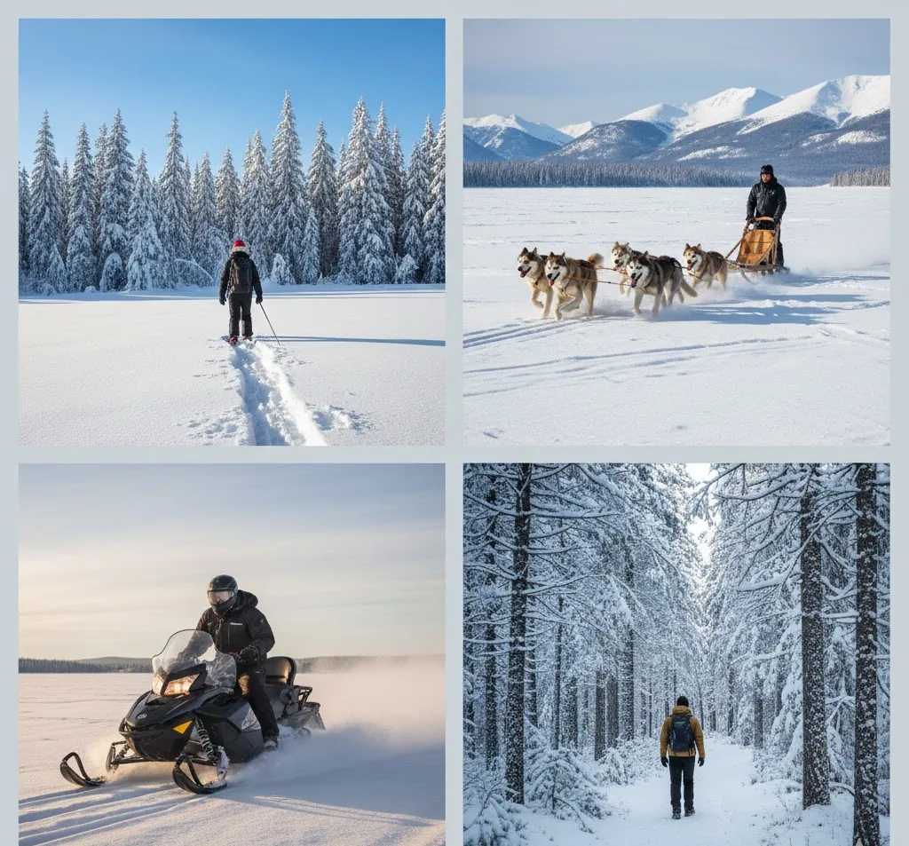 Northern Lights, husky rides, reindeer farms, Santa Village, ice fishing.