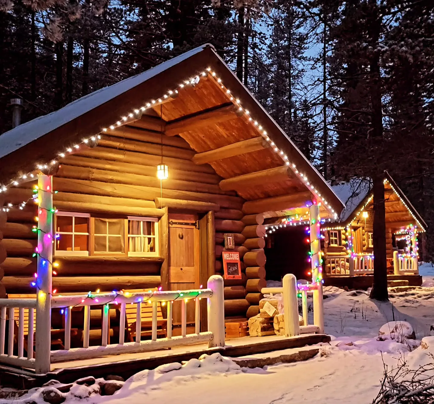 - Log cabins wrapped in fairy lights
