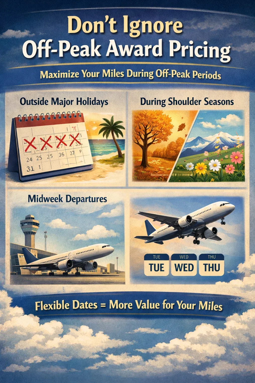 Some airlines offer off-peak award pricing — reduced mileage costs during quieter travel seasons. This is one of the easiest ways to get more value from your miles with minimal sacrifice.