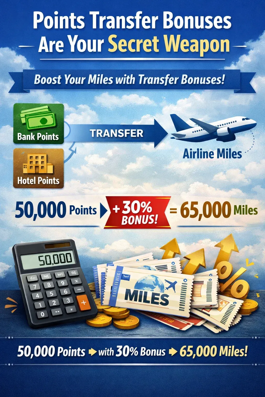 For example, transferring 50,000 points with a 30% bonus gives you 65,000 airline miles. That’s essentially free value if you plan conversions strategically.