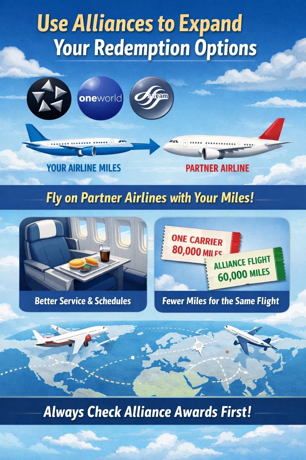 - You redeem miles from one carrier but end up flying on a partner airline with better service or schedules.