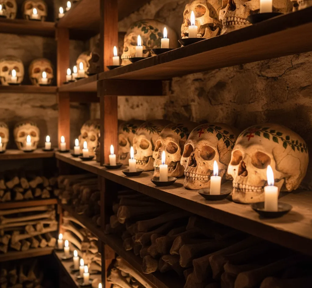 In the small St. Michael’s Chapel, you’ll find one of the most unusual — yet strangely peaceful — places in Europe: the Beinhaus, or Bone House.