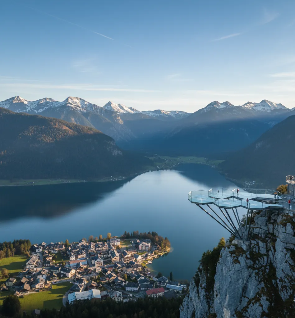 Take the funicular or hike up to the Skywalk, a glass viewing platform that juts out 350 meters above the rooftops of Hallstatt. The view from here is breathtaking — the lake glistens below, the mountains rise dramatically, and the entire village looks like a tiny dream village from a snow globe.