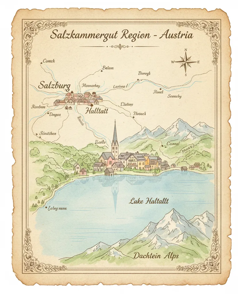 Hallstatt lies in the Salzkammergut region of Upper Austria, about 75 kilometers (46 miles) southeast of Salzburg. The village sits on the western shore of Lake Hallstatt (Hallstätter See), surrounded by the Dachstein Alps — a UNESCO World Heritage landscape that combines staggering natural beauty with deep historical roots.