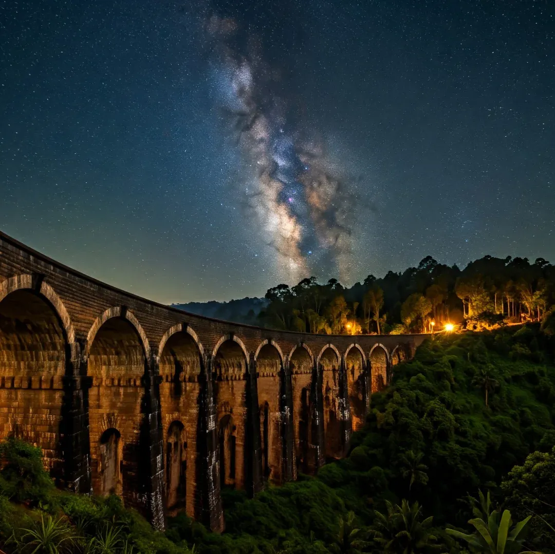 A colonial-era railway bridge in lush tea country. Capture that classic “train suddenly appears” moment or just frame the sweeping arches alone for a dreamy scene.