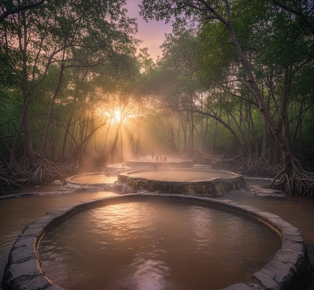 End your day with a relaxing soak in these natural saltwater hot springs, surrounded by mangroves.