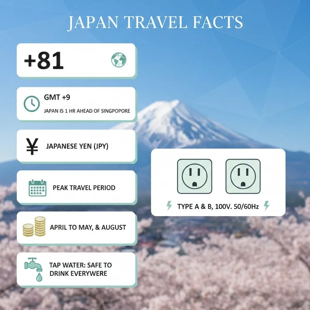 - Time Zone: GMT +9 (Japan is 1 hour ahead of Singapore)
