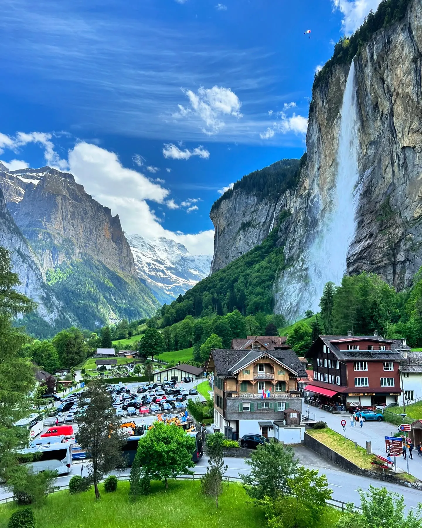 At its heart lies a peaceful Swiss village dotted with chalets, flower boxes, and cowbells echoing across meadows. The church steeple, framed by the mighty Staubbach Falls in the background, is one of the most photographed scenes in Switzerland — and maybe the world.
