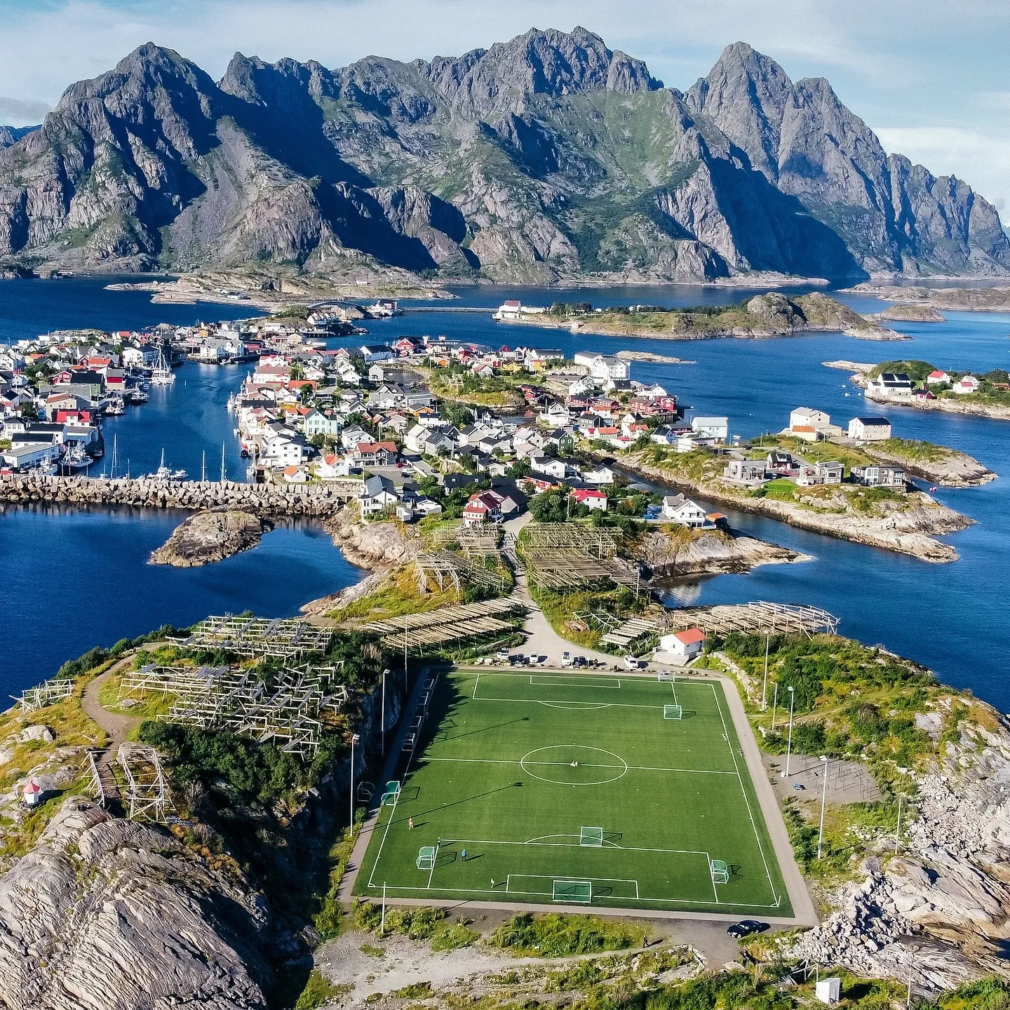Henningsvær is a charming fishing village spread across several small islands connected by bridges. It’s also home to one of the world’s most photogenic football fields. Explore art galleries, cafés, and the Henningsvær Bryggehotell harbor view.