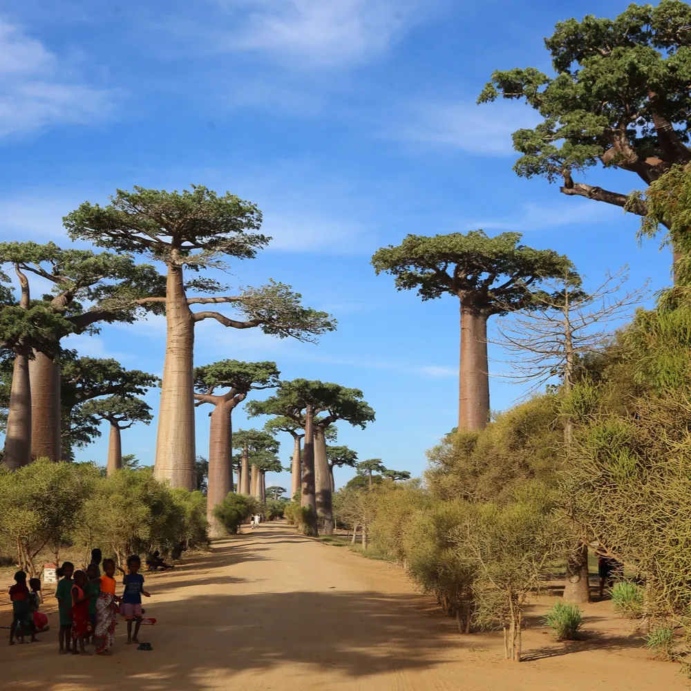 - Massive baobab trees lining a dirt road