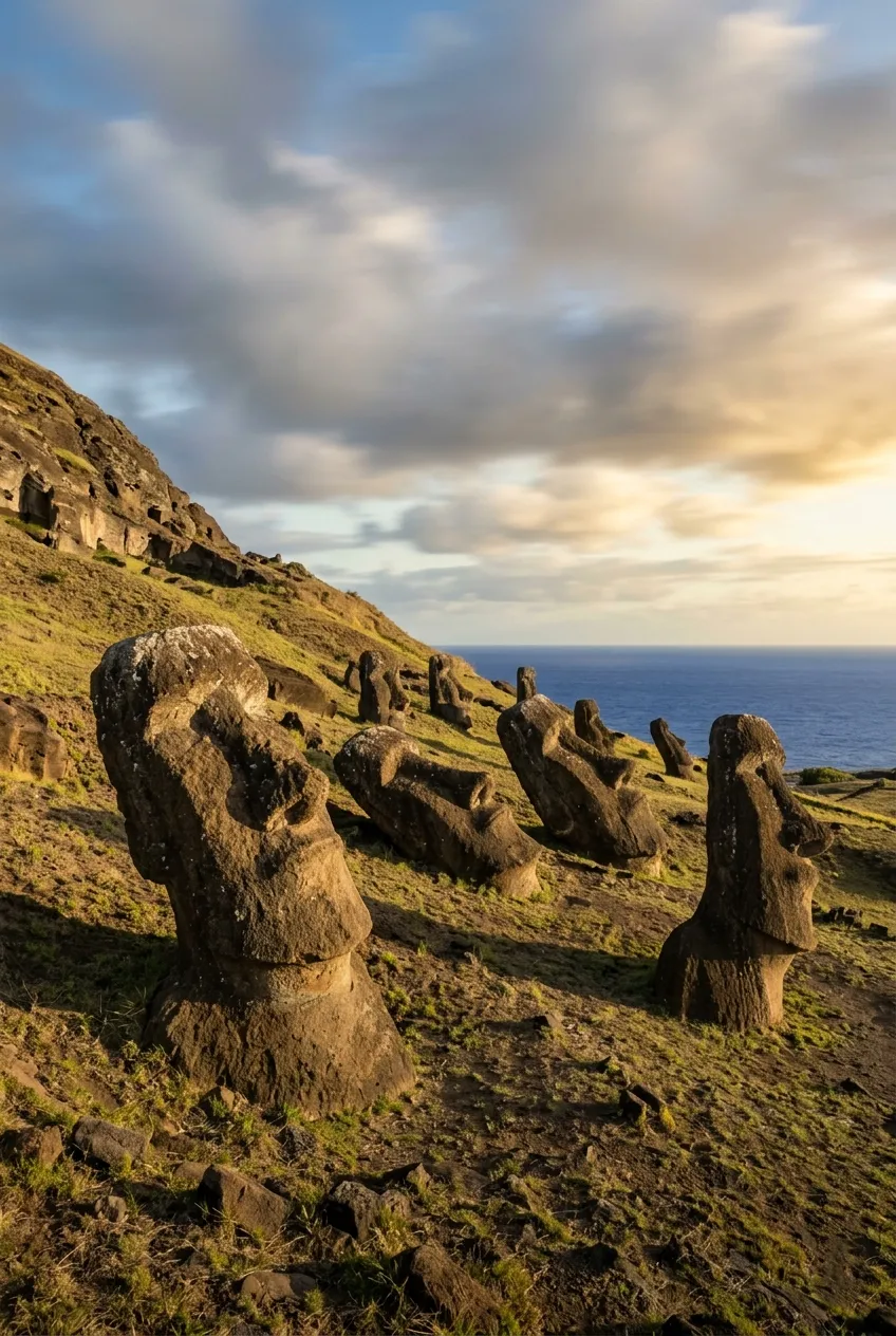 The Moai statues are still and facing the land. Huge stone statues that were carved hundreds of years ago.
