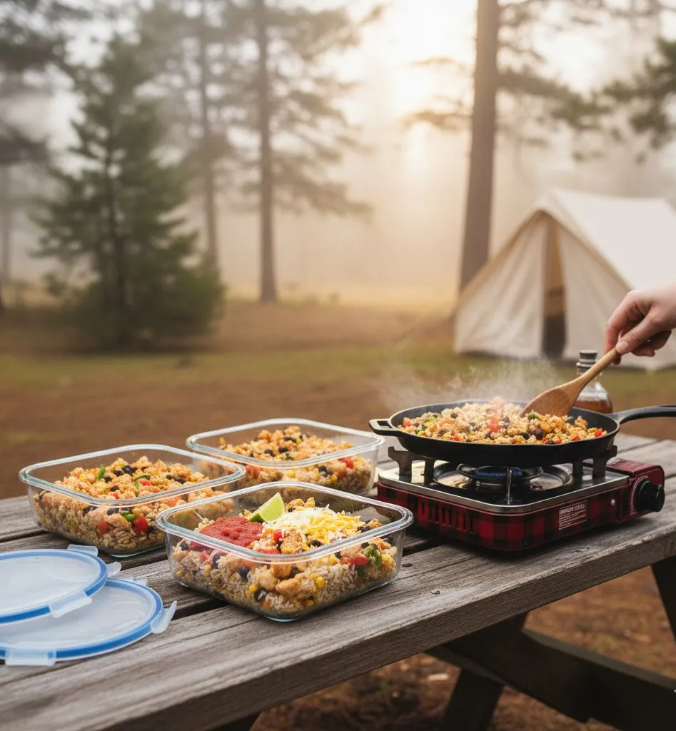 The key is preparation. You cook most meals at home, cool them safely, pack them in reusable containers, and all you do at camp is heat and eat.