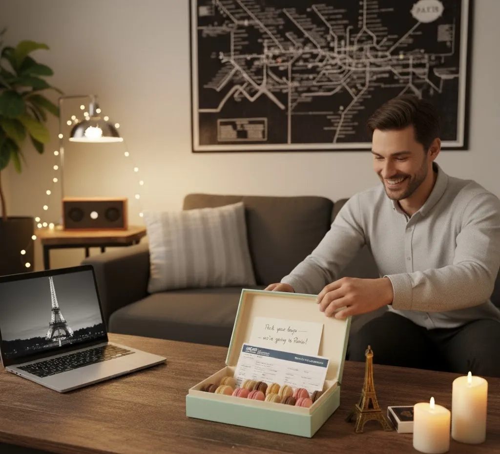 ✈️ Fun idea: Wrap the flight confirmation inside a macaron box or French book for a creative reveal.