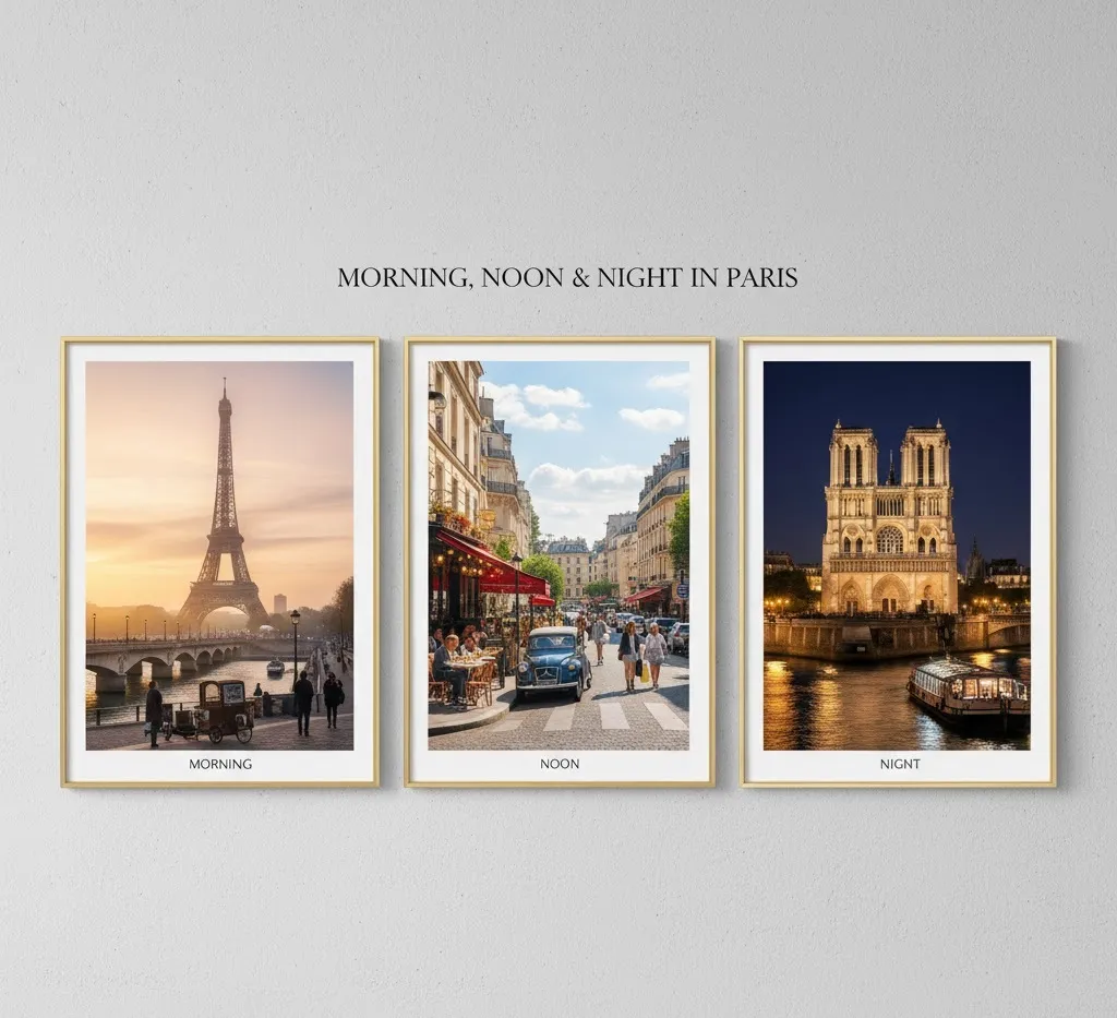 🖼️ Idea: A triptych (three-panel art) showing “Morning, Noon, and Night in Paris” makes a stunning wall centerpiece.