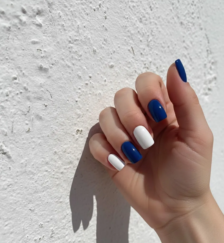 Gradient nails that shift from light azure to deep navy mimic the Aegean Seaโs shifting shades as sunlight plays on water. Use a sponge for soft blending โ itโs mesmerizing and highly photogenic.