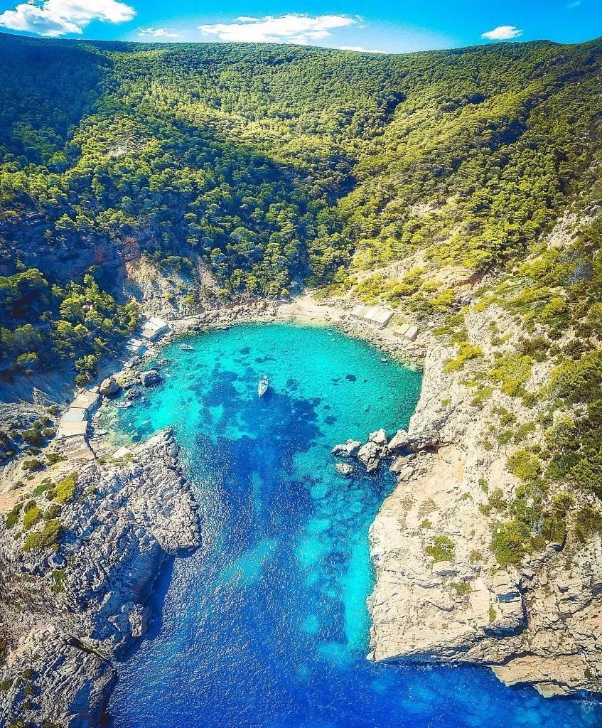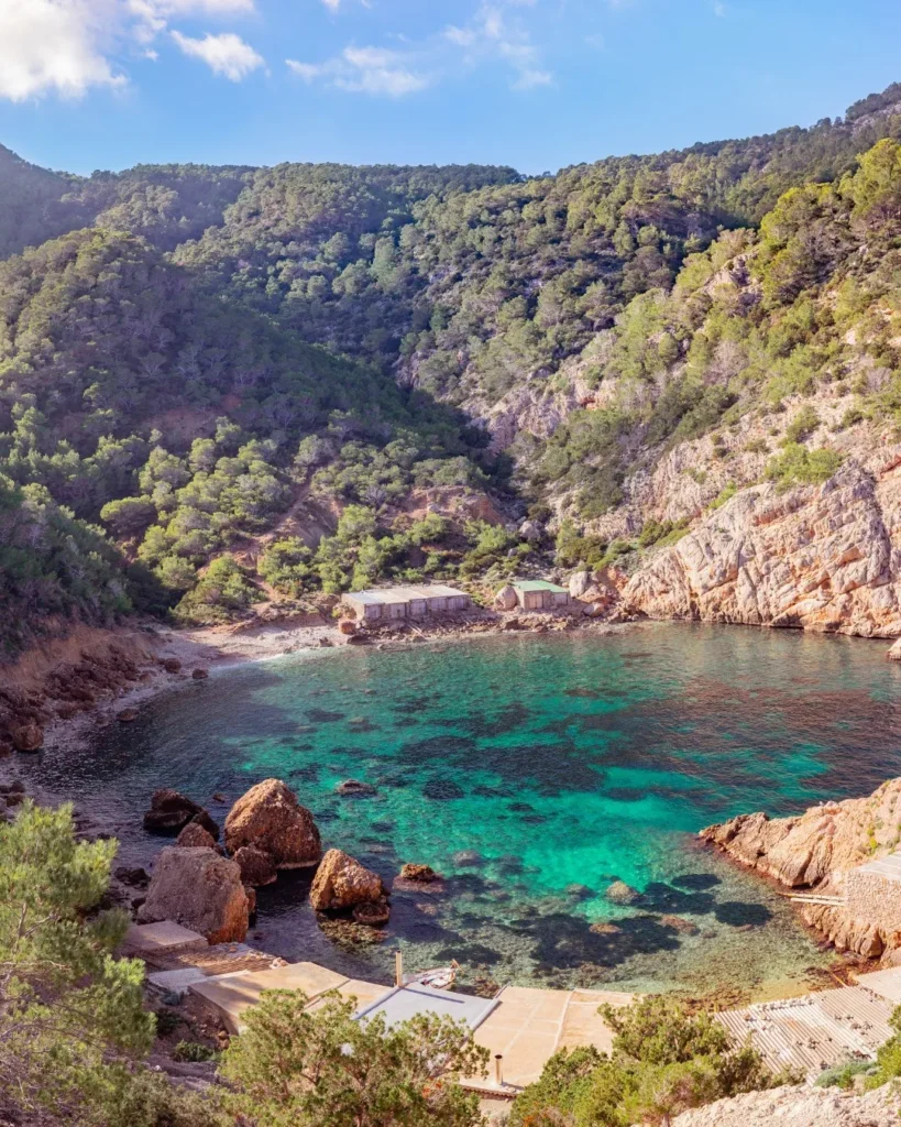 Imagine a small, horseshoe-shaped bay surrounded by pine-covered cliffs and dotted with old fishermen’s huts — that’s Es Portitxol. Located on Ibiza’s north coast, this secluded spot is accessible only via a steep 30-minute hike from the road near San Miguel.