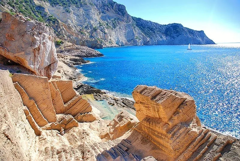 The bay is famous for its rock formation called “God’s Finger,” and it’s one of the best places to snorkel in northern Ibiza.