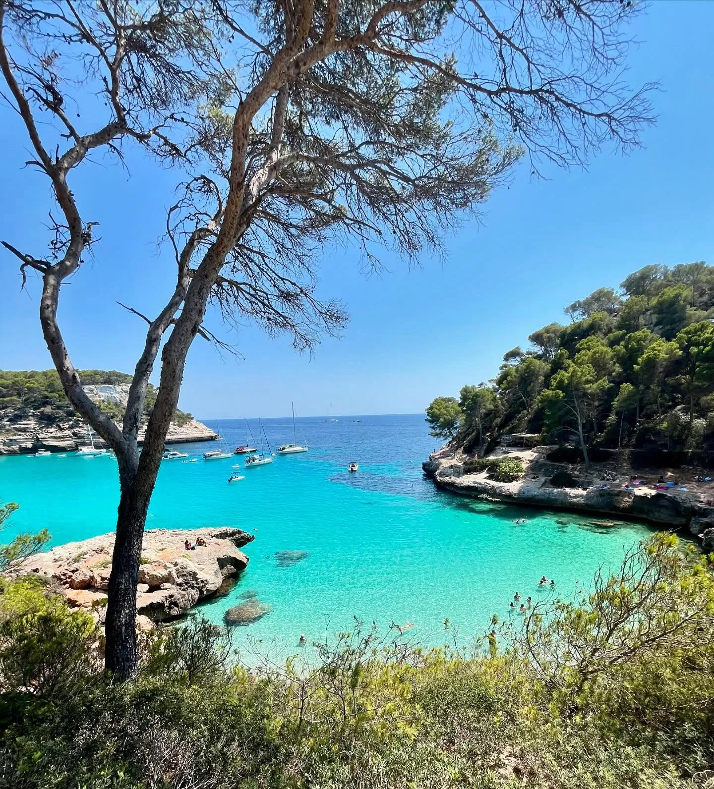 A turquoise cove framed by pine trees, ideal for swimming and snorkelling. A short walk keeps crowds manageable.