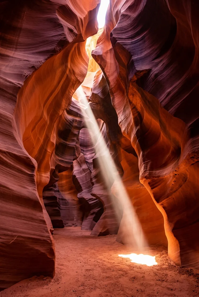 Antelope Canyon does something strange to light. Sunlight coming from above gets bounced around by the narrow sandstone walls and creates these beams that look almost solid. The walls themselves curve and flow like frozen water, carved by flash floods over thousands of years.