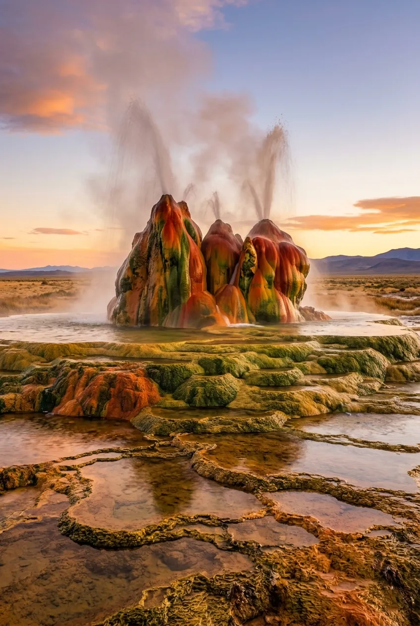 The geyser’s on private land (Burning Man Project owns it now, which kind of fits). Sprays water maybe 5 feet high from three main cones. Surrounded by terraces that look alien. The colors shift with seasons as different algae populations grow and die.