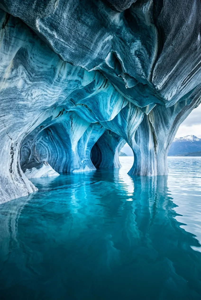 The marble itself is white and gray with pink streaks, but reflected light from the water turns everything inside into shades of blue that look impossible. Color changes with season and water level. Spring and summer (November through February in Chile) show the most intense blues because glacial melt increases mineral content.