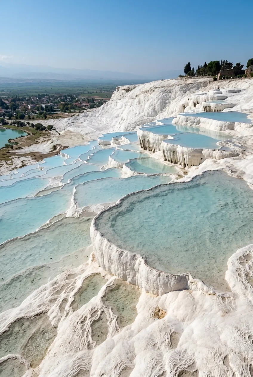 Pamukkale means “cotton castle” in Turkish. Makes sense when you see it. White terraces cascading down a hillside like frozen waterfalls. Except they’re travertine, a sedimentary rock deposited by calcium-rich thermal springs that have been flowing here for thousands of years.