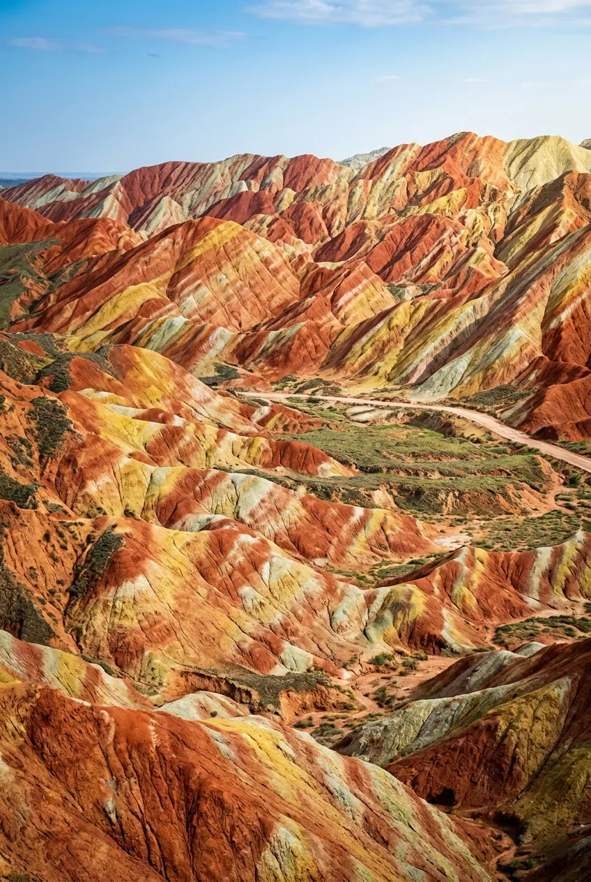 Imagine mountains decided to be every color at once. Red, yellow, orange, green, blue, all in horizontal stripes like someone was testing paint samples and just kept going.