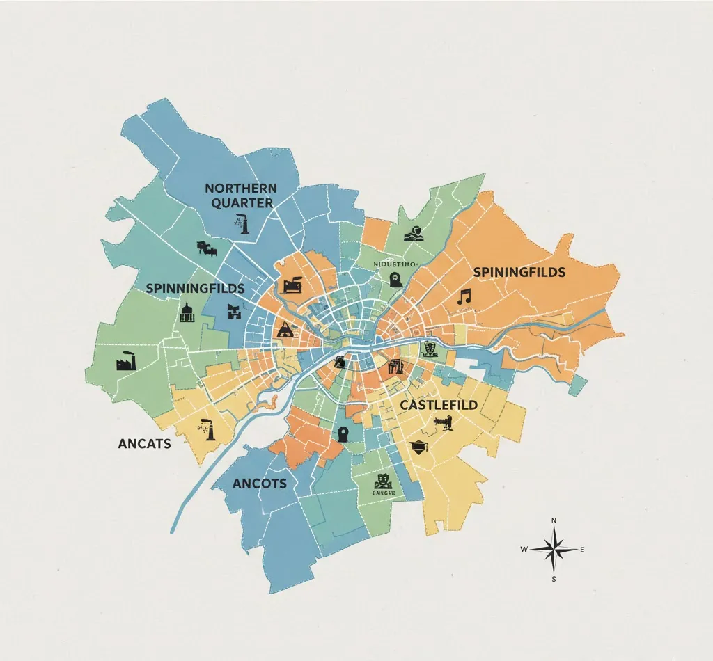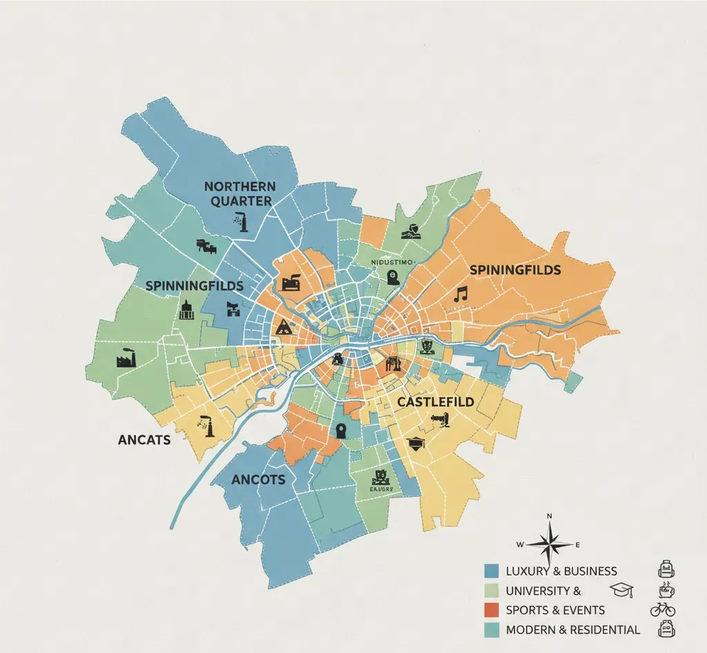 Manchester is compact but diverse. Each neighborhood has a distinct vibe, price range, and travel convenience. Staying in the right area means: